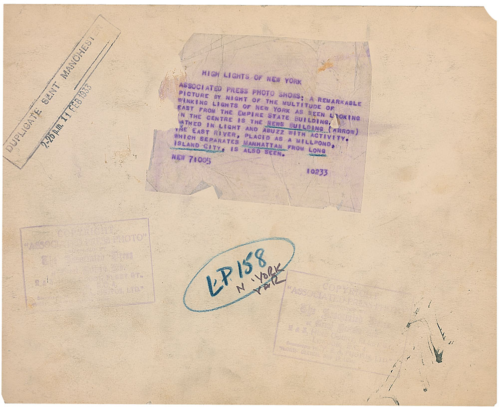 Original large 11.25 x 9 early 1900s gelatin silver photograph of the nighttime New York City skyline shot from the Empire State Building. The striking image shows the East River, Manhattan and Long Island. The back of the photo has vintage Associated Press stamps and descriptive tag along with a 1933 date stamp. The image is sharp and clean, the photo itself has edge wear and corner chips and light back soiling. RR Auction COA.