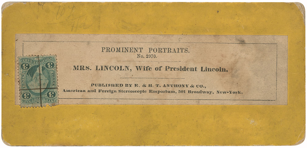 Original 1860s albumen stereoview photograph of Lincoln by the E. & H.T. Anthony & Company studio. A 3 cent tax stamp is affixed to the reverse. The image is well aged with foxing and fading typical to albumen prints, with notations along the bottom edge in an unknown hand. The yellow mount has soiling and edge wear. RR Auction COA.
