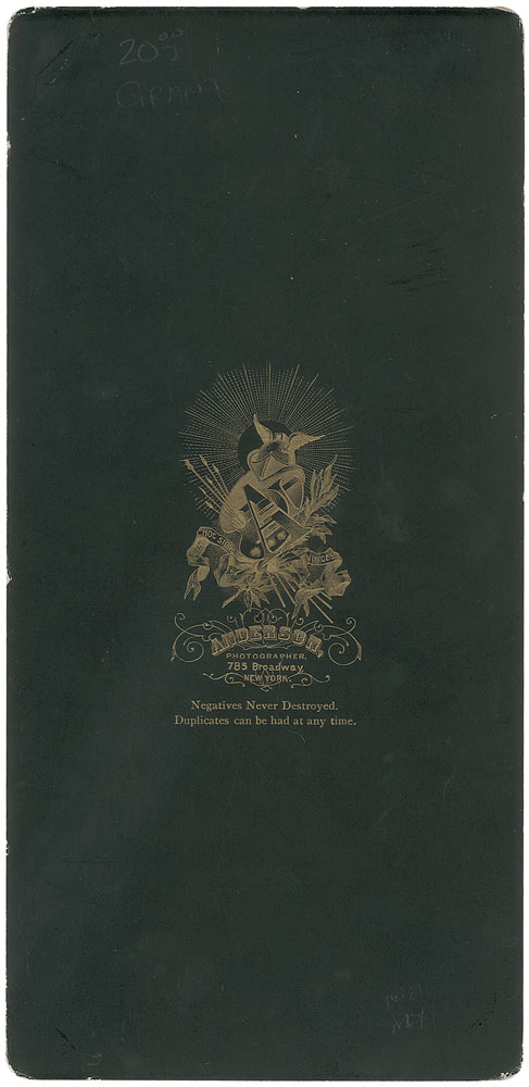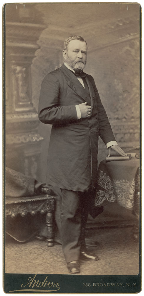 Extremely attractive late 19th century card photograph of Grant by Anderson of New York City. Photo measures 4 x 8.25, with a beautiful black mount with genuine gold edges and lettering. The image is clear with lush tones. Light pencil note on the black back. Light general wear, presents beautifully. RR Auction COA.