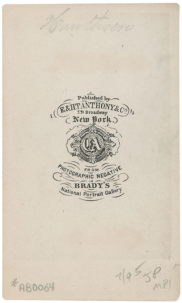 Circa 1860s carte-de-visite portrait of Hawthorne, 2.5 x 4, published by E. & H. T. Anthony from the Mathew Brady negative. Pencil notes on back, light mount wear, image aging and foxing. Presents nicely with a detailed image. RR Auction COA.