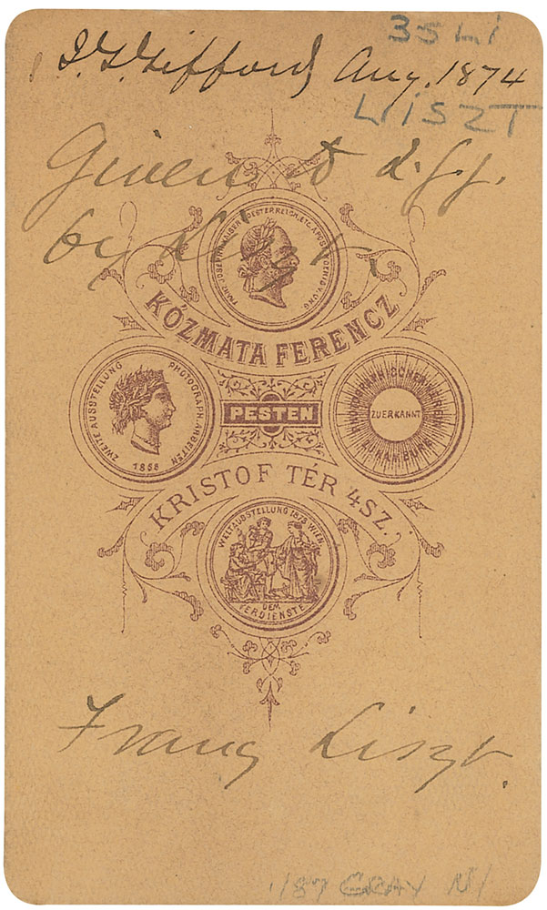 Original albumen carte-de-visite portrait of composer Franz Liszt with photographer's stamp to front and back. Paper loss to the bottom of the front, mark on front left, writing on back and general wear. Sharp and clear image. RR Auction COA.