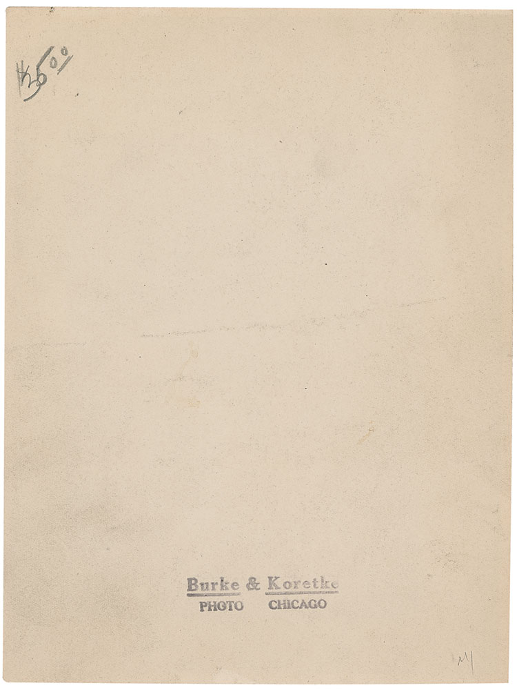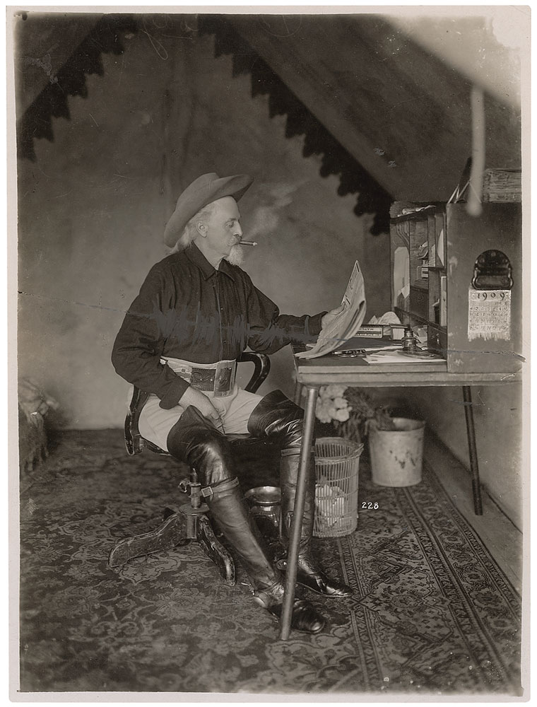Original 6.25 x 8.5 gelatin silver photograph of Cody smoking a cigar and reading the newspaper at his desk, by the famous studio Burke and Koretke of Chicago. Sharp and detailed image with light silvering. Pencil note on back and general wear including light wrinkling and edge wear. The image has a grease pen line across the middle, likely made during its use as a newspaper photo. RR Auction COA.