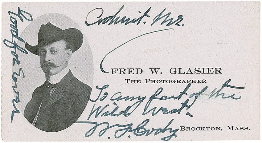 Handwritten show pass on photographer Fred W. Glasier’s 4 x 2 business card. In full: “Admit Mr. [Fred W. Glasier] to any fort of the Wild West. Good for Ever. W. F. Cody.” In fine condition, with a couple light creases to the right side, a few scattered surface marks, and a mild area of moisture exposure affecting the “of the” in Cody’s writing. Glasier, known for his circus photography, shot at least one of Cody’s shows in 1907. A rare, exquisite example from the Wild West showman. RR Auction COA.