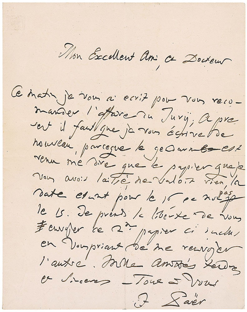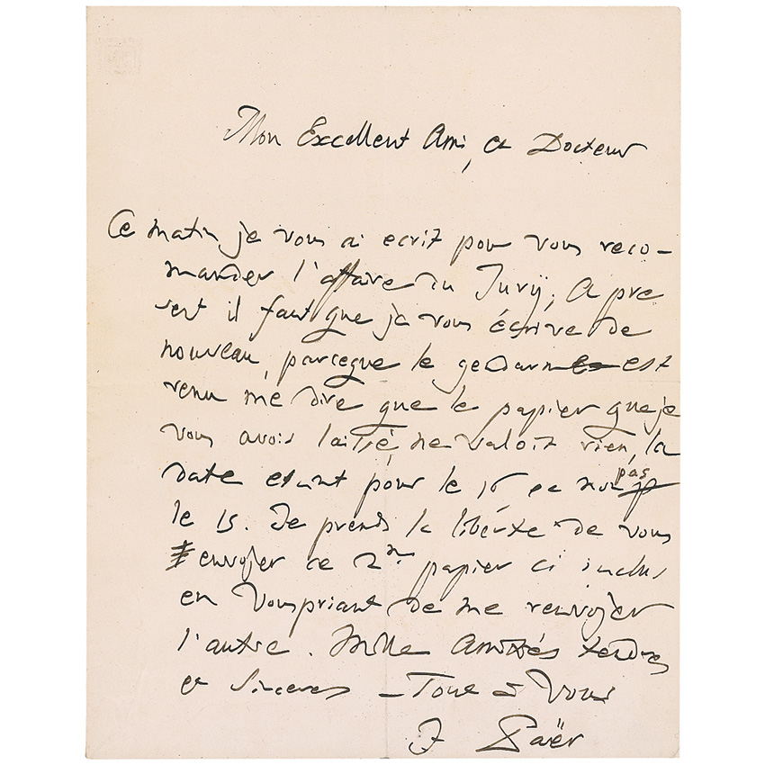 Italian-born composer and opera director (1771–1839) who was one of the first teachers of the young Franz Liszt. ALS in French, signed “F. Paer,” one page, 7.5 x 9.5, no date. Paer appears to have been caught passing bad checks, and pens a letter regarding these legal matters. In part (translated): “This morning I wrote to you in order to bring to your attention the matter of the Jury; and now, I must write you once again because the gendarme came to tell me that the paper I had left with you is worthless, since it is dated for the 16th and not the 15th. I take the liberty of sending you this second paper, enclosed herewith, and ask that you back the other.” Central vertical and horizontal folds, scattered creases, and some mild toning, otherwise fine condition. RR Auction COA.