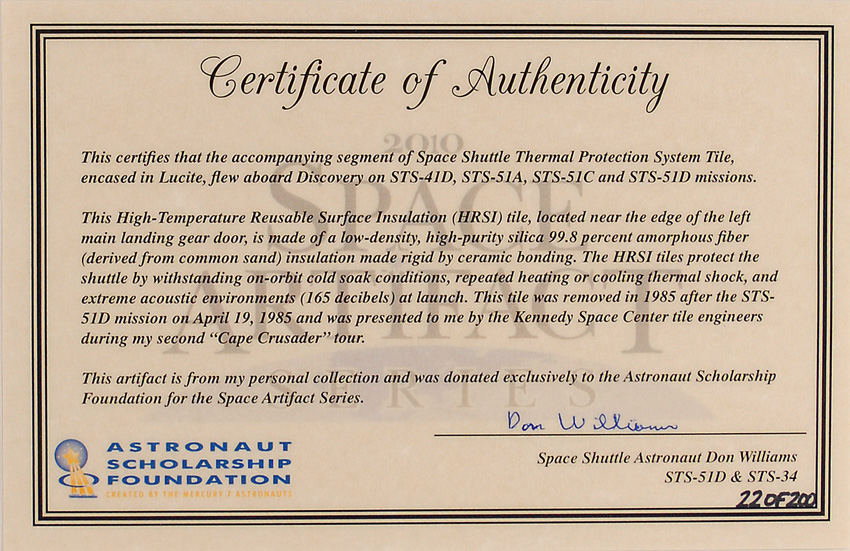 Flown thermal protection system tile segment from Space Shuttle Discovery, approximately .75 x .5, removed after the STS-51D mission. Encased in a cylindrical 2.75 x 3 piece of Lucite cut at an angle for display purposes, with a Discovery emblem and certificate of authenticity at the bottom. A limited edition piece, numbered #22/200, originally distributed through the Astronaut Scholarship Foundation. In fine condition. Accompanied by a matching certificate of authenticity signed by astronaut Don Williams certifying that it is a piece from his personal collection. RRAuction COA.