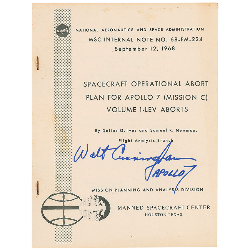 Abort Plan for Apollo 7, Volume I—LEV Aborts manual, dated September 12, 1968, 8 x 10.5, 27 pages, bound by two staples along the left edge. Introduction states, in part: “The LEV is designed to accelerate the command module (CM) away from the launch vehicle to a safe separation distance and far enough down range from the launch pad for a safe water landing.” Signed on the front cover in blue felt tip, “Walt Cunningham, Apollo 7.” In fine condition, with some scattered light toning and foxing to inside pages. Pre-certified Steve Zarelli and RR Auction COA.