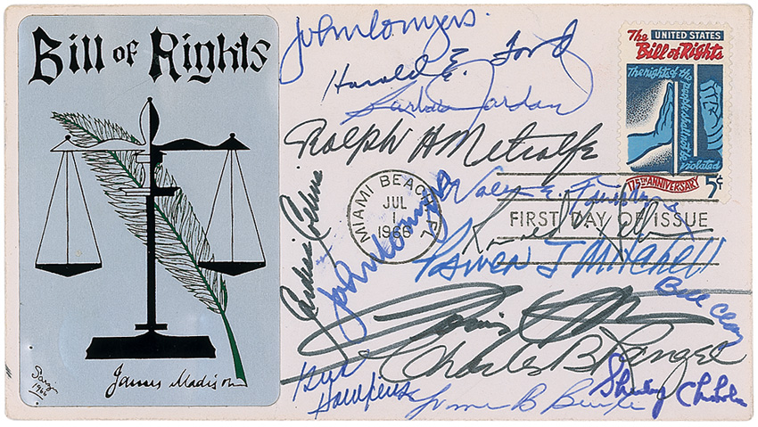 FDC with a metallic cachet honoring the Bill of Rights, signed in felt tip and ballpoint by fourteen notable politicians active in supporting civil rights, including Ralph Metcalfe, Shirley Chisholm, Harold E. Ford, Charles B. Rangel, John Conyers (2), Gus Hawkins, Barbara Jordan, Bill Clay, and Cardiss Collins. In fine condition, with a few dings to the cachet. RRAuction COA.