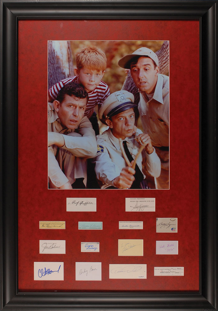 Ink and felt tip signatures of 14 cast members of The Andy Griffith Show on various size cards, album pages, and slips. Signers are: Andy Griffith, Don Knotts, Ron Howard, Frances Bavier, Aneta Corsaut, Betty Lynn, Jim Nabors, George Lindsey, Allan Melvin (ins), Hal Smith, Clint Howard, Howard Morris, Denver Pyle, and Parley Baer. All are matted and framed together with an oversized portrait of the primary cast to an overall size of 28.25 x 40.5. In fine condition. Pre-certified PSA/DNA and RR Auction COA.