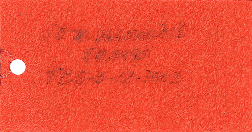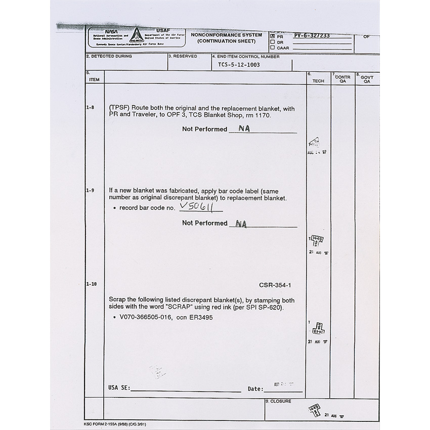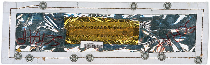 Available to US bidders only. Shuttle TCS payload bay blanket. Blanket, most likely flown, #V070-366505-016, measures 11 x 3.5, and is labeled “Scrap” on both sides in a technician’s hand. Blanket is accompanied by a copy of a NASA Nonconformance System report noting the scraping of the part as well as a red tag. In fine condition. RRAuction COA.