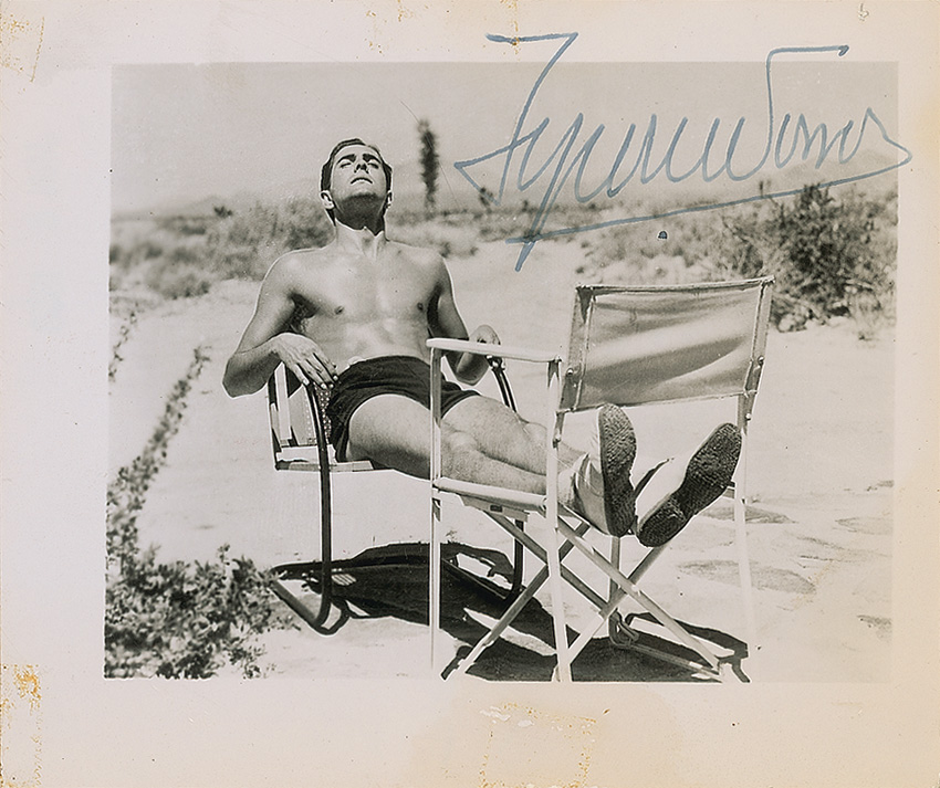 Vintage glossy 5 x 4 photo of Power lounging on the beach, signed in fountain pen. In very good condition, with light scattered impressions and soiling, some adhesive remnants to the borders, and a tack hole to the upper right corner. Pre-certified PSA/DNA and RR Auction COA.