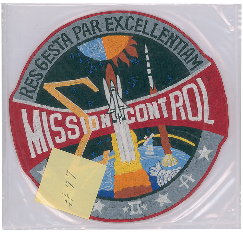 Huge flown Mission Control patch, 11.5″ in diameter, carried on board the Atlantis on STS-27 from December 2–6, 1988. Accompanied by a 1988 letter from a NASA employee to the Director of Flight Crew Operations certifying that “Item #77—1 Each 11″ Mission Control Embroidered Patch” was “flown in the Official Flight Kit aboard the orbiter Atlantis.” Patch is still sealed in its original plastic with a Post-It note numbered #77 inside the plastic. In fine condition. The mission control patch was designed for Gene Kranz by Robert McCall in 1973, with the Latin phrase across the top reading “Achievement Through Excellence.” RRAuction COA.