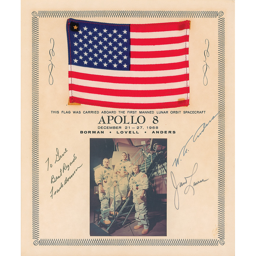 Flown printed fabric American flag, 6 x 4, flown to the moon on Apollo 8. Flag is affixed to the top of a 10 x 12 certificate stating “This flag was carried aboard the first manned lunar orbit spacecraft Apollo 8 December 21–27, 1968.” A 3.5 x 4.5 crew photo is affixed at the bottom of the certificate. Certificate is signed and inscribed in black felt tip, “To Gene, Best regards, Frank Borman,” and “James Lovell.” Certificate also bears an autopen signature of Bill Anders. In fine condition, with four small squares of toning to corners of flag from adhesive on reverse, crease to top right corner, and a bit of trivial soiling to lower right corner. Pre-certified Steve Zarelli and RR Auction COA.