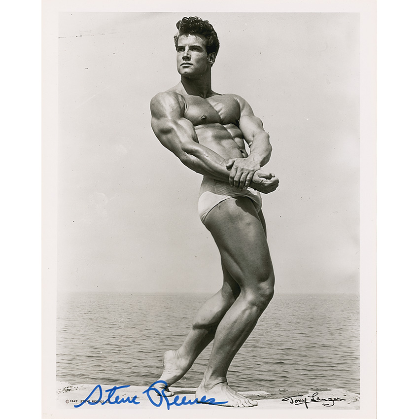 Glossy 8 x 10 photo of Reeves flexing his muscles by the ocean, signed in blue felt tip. In fine condition. Pre-certified PSA/DNA and RR Auction COA.