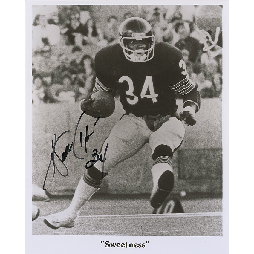 Glossy 8 x 10 photo of Payton with the football, signed in black felt tip, Walter Payton 34.” In fine condition. Pre-certified Steve Grad/PSA/DNA and RR Auction COA.