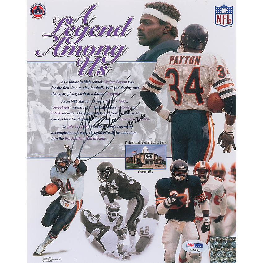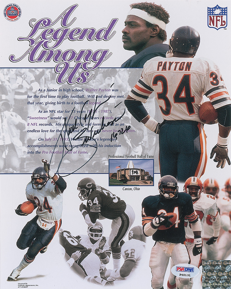 Color 8 x 10 cardstock composite photo entitled ‘A Legend Among Us’ honoring Payton’s Hall of Fame career, signed in black felt tip, “Walter Payton, Sweetness, 16,726.” In fine condition, with a PSA/DNA label affixed to the lower right corner. Accompanied by a certificate of authenticity from PSA/DNA. RR Auction COA.