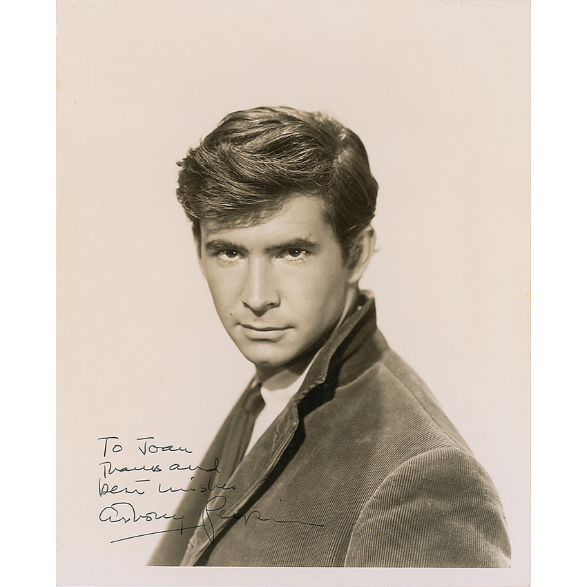 Dashing vintage glossy 8 x 10 photo, signed and inscribed in fountain pen “To Joan, thanks and best wishes, Anthony Perkins.” Light surface creases and impressions, and some trivial spotting to the finish, otherwise fine condition. Pre-certified PSA/DNA and RR Auction COA.
