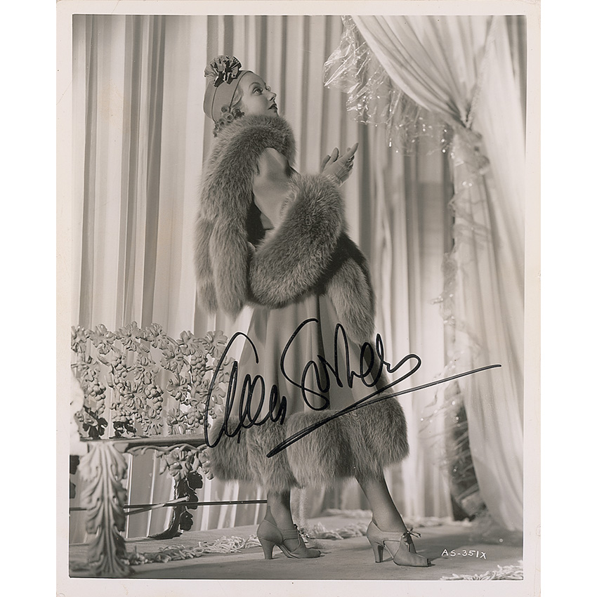 Elegant glossy 8 x 10 full-length Bachrach photo of Sothern in a fur coat, signed in black felt tip. In very good condition, with scattered creases and impressions, a mild area of toning to the upper left, binder dings to the right edge, and some wear to the corner tips. Pre-certified PSA/DNA and RR Auction COA.