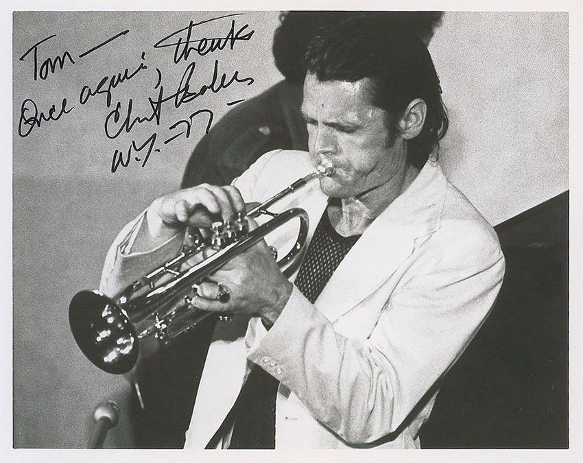 Tragic jazz great whose intimate playing style established him as a great talent until his drug-related death in 1988. Rare satin-finish 10 x 8 photo of Baker playing his trumpet on stage, signed and inscribed in black felt tip “Tom—Once again, thanks, Chet Baker, N.Y–77.” In fine condition. A seldom encountered autograph from the celebrated musician. Pre-certified Roger Epperson/REAL and RR Auction COA.
