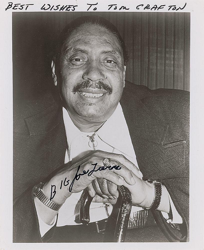American bluesman (1911-1985) from Kansas City. Although he came to his greatest fame in the 1950s with his pioneering rock and roll recordings, particularly ‘Shake, Rattle and Roll,’ Turner's career as a performer stretched from the 1920s into the 1980s. Glossy 8 x 10 photo of Turner resting his hands on his cane, signed and inscribed in black felt tip “Best wishes to Tom Grafton, Big Joe Turner.” Scattered creases, mainly to edges and corners, otherwise fine condition. RR Auction COA.