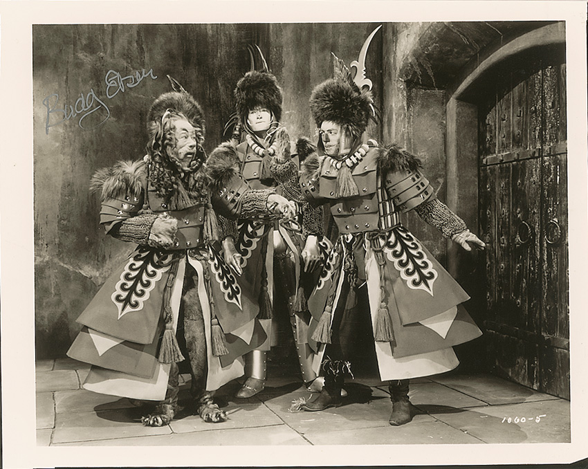 Matte-finish 10 x 8 photo of Ebsen in the Tin Man role he was famously forced to abandon because of a severe reaction to the aluminum-based makeup, signed in the upper left in silver ink. In fine condition, with slight rippling to the top and bottom edges, and some black printing irregularities to the very edges. Pre-certified PSA/DNA and RR Auction COA.
