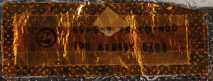 Available to US bidders only. Light weight silver finish insulation pad, measuring approximately 11.5 x 8 x 2 with four snaps, and restraint buttons on top and bottom. Pad is part number V070-366819-001, labeled “Scrap” on the top and bottom, and is most likely flown. In fine condition. Provenance: Charles Bell Estate. RRAuction COA.