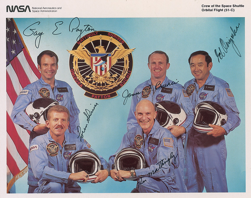 Color 10 x 8 NASA photo of the crew of Shuttle flight 51-C, signed in black felt tip, “El Onizuka,” and bearing autopen signatures of crew members Ken Mattingly, Gary Payton, Loren Shriver, and James Buchli. In fine condition. Pre-certified Steve Zarelli and RR Auction COA.
