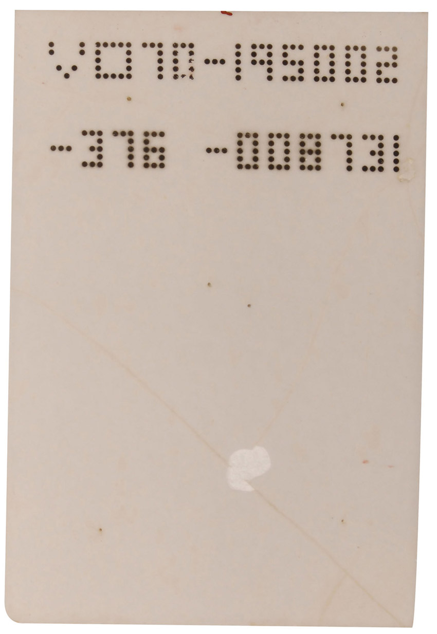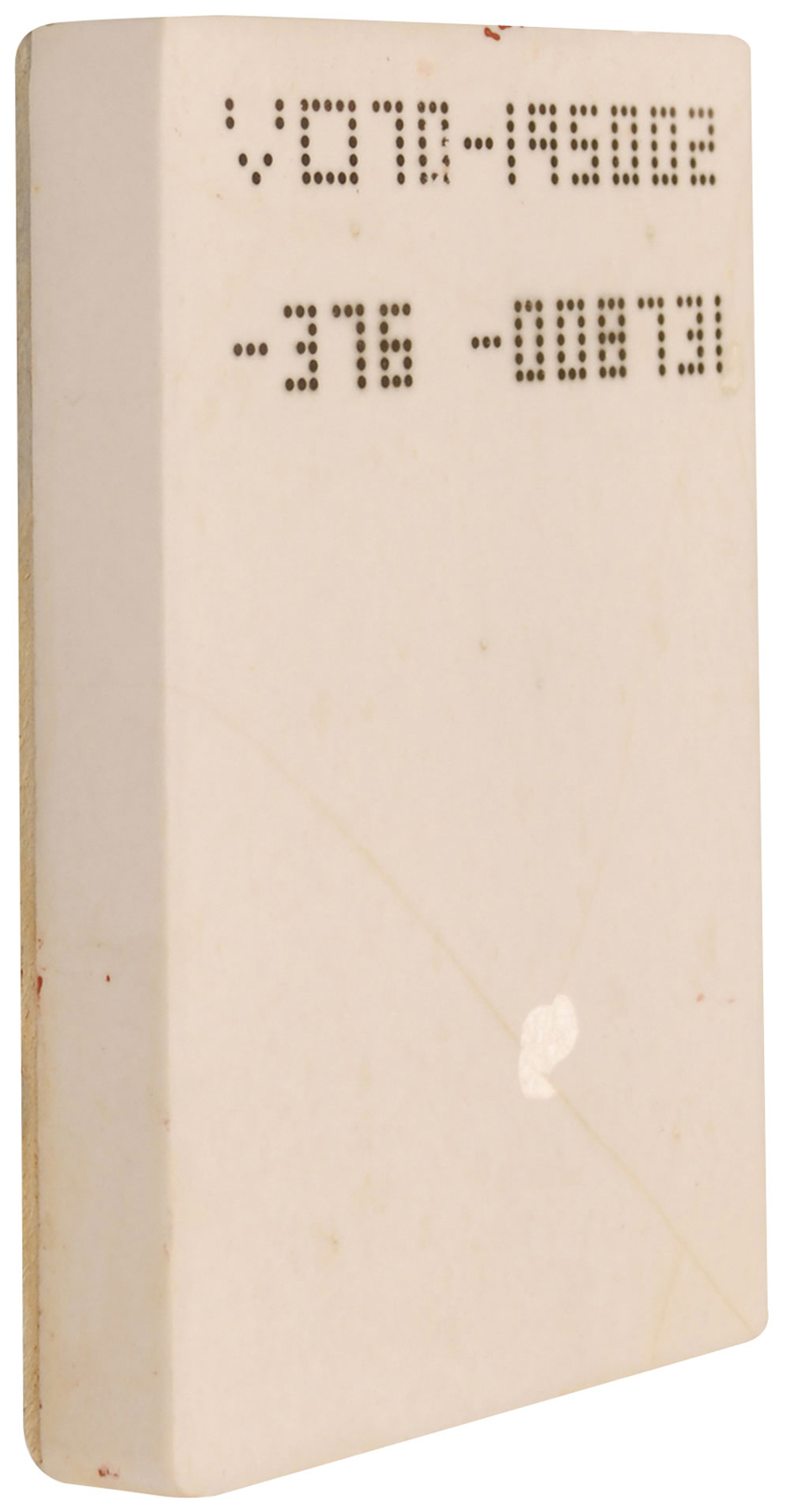 Available to US bidders only. Very rare Challenger-flown LRSI (Low-temperature Reusable Surface Insulation) tile, 5.5 x 8, #V070-195002-376-008731, and stamped on the reverse “099.” Tile was flown on the first six flights of Challenger: STS-6 (maiden voyage), STS-7, 8, 41-B, 41-C, and 41-G, before being replaced. Accompanied by its Flown Hardware tag, filled in by a technician, “Orbiter No. 099, STS Number 17,” (referring to its 17th processing flow), dated December 1, 1984. These tiles would cover the upper wing near the leading edge. They are also used in selected areas of the forward, mid, and aft fuselage, vertical tail, and the OMS/RCS pods. These tiles protect areas where reentry temperatures are below 1,200 °F. The white color is by design and helps to manage heat on orbit when the orbiter is exposed to direct sunlight. These tiles are reusable for up to 100 missions with refurbishment (100 missions is also the design lifetime of each orbiter). White tiles rarely become available for sale. Even more rarely are they available and stamped on the back as 099 ref, to OV-099 original, as this one is. RRAuction COA.