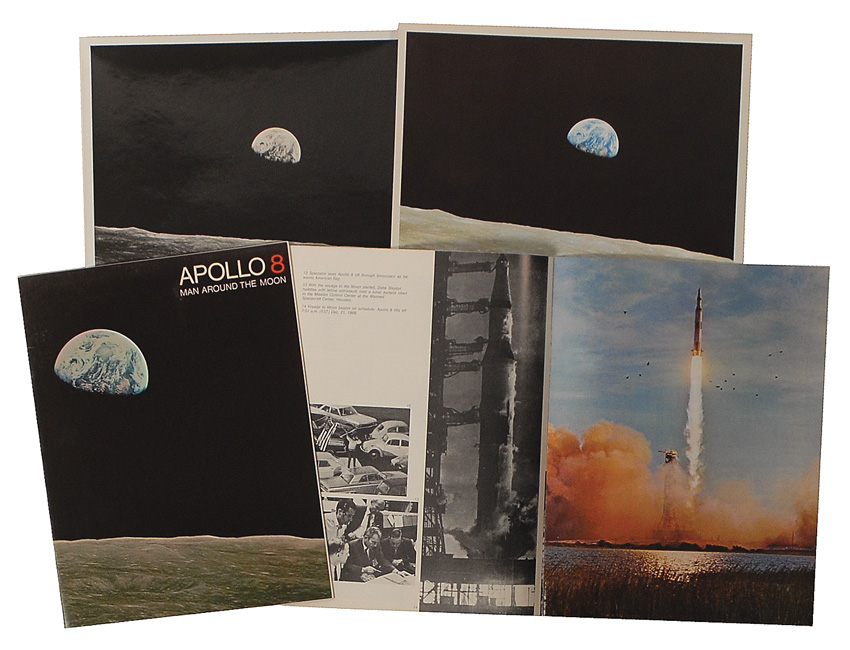 Four items: one color 10 x 8 NASA photo of the view of Earth from the Apollo 8 spacecraft; one 10 x 8 glossy photo of the same image; and two booklets entitled Apollo 8: Man Around the Moon, 7.75 x 10.25, 24 pages, featuring many images from the flight. In overall fine condition, with a few creases to the glossy photo. RRAuction COA.