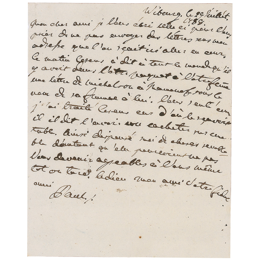 Emperor of Russia (born 1754) from 1796 until his assassination in 1801, the son of Catherine the Great, and a champion of the poorer classes, his sweeping reforms alienated the Russian nobility and were thought to have provided a prime motivation for the conspiracy that led to his brutal death. ALS in French, one page, 5.75 x 7, July 29, 1788. Letter, written from Wibourg, to General Christoph von Benckendorff. In part (translated): “I write this to ask you not to send letters not bearing my address received when the court is not present. This morning Cesens told everybody what was in your package to your wife a letter from Michelson to Mannanof…such things may turn out to be agreeable to you sooner of later.” In fine condition, with central horizontal and vertical fold and some scattered light creases. RRAuction COA.