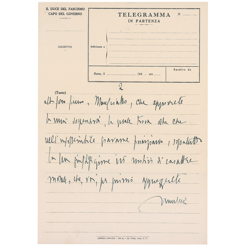 War-dated handwritten telegram, in Italian, signed “Mussolini,” two pages, 8.25 x 11.5, on his personal telegram stationery headed “The Duce [Leader] of Fascism” and “Head of the Government,” December 30, 1943. Mussolini sends a telegram to Marshal Rodolfo Graziani, Minister of Defense of the Italian Social Republic and Commander-in-Chief of the Italian forces still fighting on the German side after his rescue by SS Col. Skorzeny’s special forces on September 12, 1943. In full (translated): “I’m informing you that by my decree published in the Official Gazette the 15th of this month…I have temporarily suspended payments to the armed forces…War indemnities are to be given only to those who in fact make War…civil servants cannot benefit from similar allowances…I am certain, Marshal, that you approve of my suspension, which is justified not only by our insupportable financial burden but most especially by reasons of a moral nature, which you will be the first to appreciate.” Central horizontal fold to both pages, several blue pencil notations to text, and some light toning, otherwise fine condition.