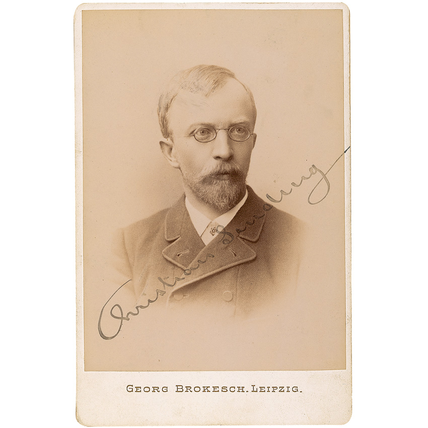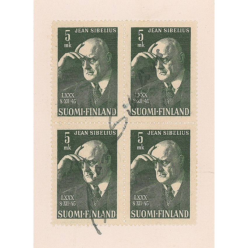 Two items: rare original 4.25 x 6.5 cabinet photo of Christian Sinding, by George Brokesch of Leipzig, signed across the image in black ink; and a block of four Finnish postage stamps honoring Jean Sibelius, signed in black ink. Moderate contrast to Sibelius’s signature, otherwise fine condition. RRAuction COA.