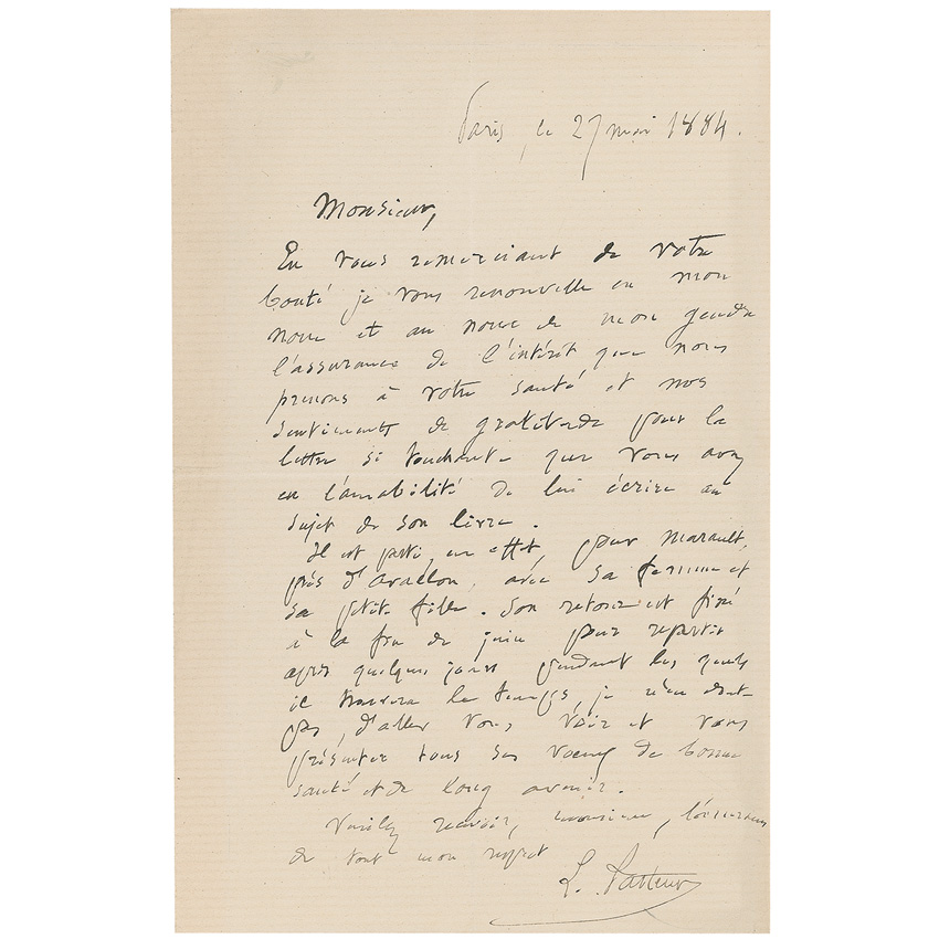 ALS in French, signed “L. Pasteur,” one page, 5.25 x 8, May 27, 1884. Letter to an unidentified gentleman. In part (translated): “In thanking you for your kindness I renew, in my name and my son-in-law’s…the interest we take in your health. We are grateful for your very touching letter…on the subject of his book [Pasteur himself]. He has left…With his Wife and daughter…and will return to present all his wishes for your good health and a long future.” In fine condition, with central horizontal and vertical fold and some scattered toning. In 1884, Pasteur’s son-in-law, René Vallery-Radot published the first biography of Pasteur. Pre-certified PSA/DNA and RR Auction COA.