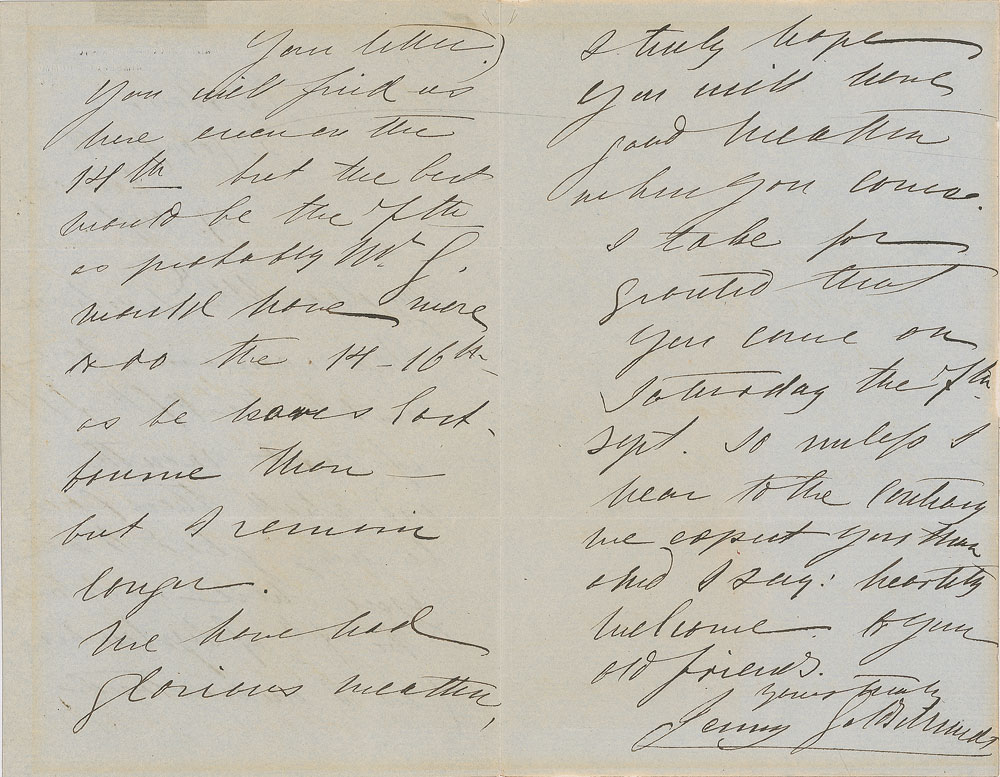 Celebrated soprano (1820–1887), known as the ‘Swedish Nightingale,’ who, under the management of P. T. Barnum, became the most renowned and highly paid singer of her day. ALS signed “Jenny Goldschmidt,” three pages on two adjoining sheets, 4.5 x 7, August 29, no year. Letter to a friend regarding travel plans. In part: “We remain here until the 17th or 18 of next month—and therefore shall be very glad to see you here on Saturday the 7th of September.” Second integral page professionally inlaid into a slightly larger sheet. In fine condition, with toning to the borders, some show-through from writing on opposing sides, and tape remnants and ink notations to the upper border of the first page. RR Auction COA.