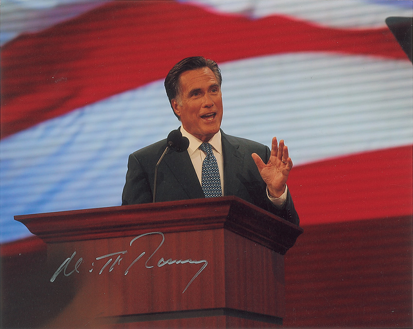 Color satin-finish 10 x 8 photo of Romney making a speech, signed in silver ink. In fine condition. RRAuction COA.