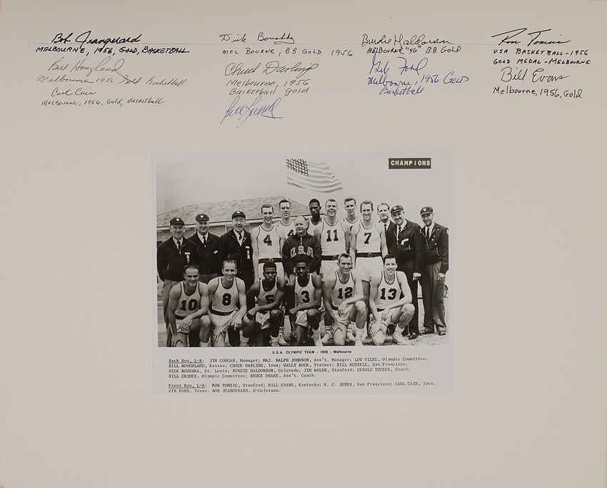 Glossy 10 x 8 photo of the 1956 United States Olympic basketball team affixed to a 20 x 16 white cardstock mount, signed on the mount in felt tip and ballpoint by Bill Russell, Bob Jeangerard, Bill Hougland, Carl Cain, Dick Boushka, Chuck Darling, Burdie Haldorson, Gib Ford, Ron Tomsic, and Billy Evans, with most adding something about the Olympics below their signature. In fine condition, with a light pencil notation. Pre-certified Steve Grad/PSA/DNA and RR Auction COA.