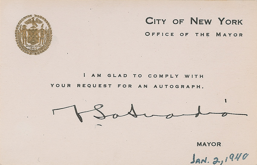 Vintage fountain pen signature, “F. LaGuardia,” on an off-white 4.75 x 3 embossed city of New York correspondence card, dated January 2, 1940 in an unknown hand. In fine condition. RRAuction COA.