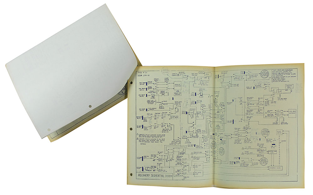Set of 20 different blueprints for various systems of the Gemini Capsule, 17 x 11, including power systems, “retrograde sequential system,” “post impact sequential system,” “communications system,” “ASCS thrust control and sequencing,” “instrumentation system,” “periscope system,” “clock system,” and “bio-medical system.” A central vertical fold, toning to the borders, and a rusty binding staple to the upper left corner, otherwise fine condition. Provenance: Aurora Auction, November 2003, The Deke Slayton Estate collection. RR Auction COA.