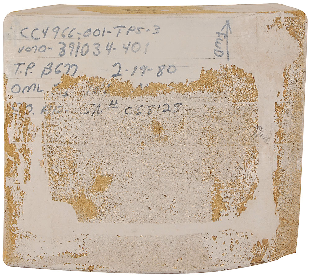 Available to US bidders only. Shuttle curved fit check tile, 7.5 x 6 x 2.75, marked “S/N #C68128,” with other notations on the same side. Before crews installed the actual reentry-enabling thermal heat shield, fit-check tiles were fabricated and installed on the orbiter's body. These ‘stand-in’ tiles were then referenced to manufacture their flight-ready counterparts. Scattered surface loss, otherwise fine condition. RR Auction COA.