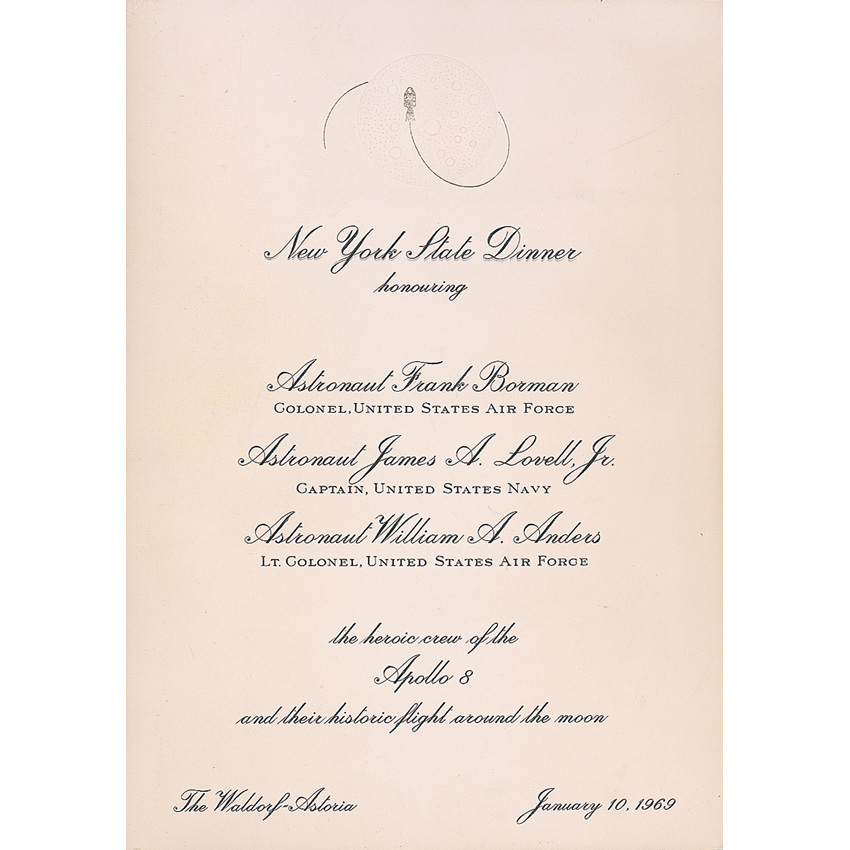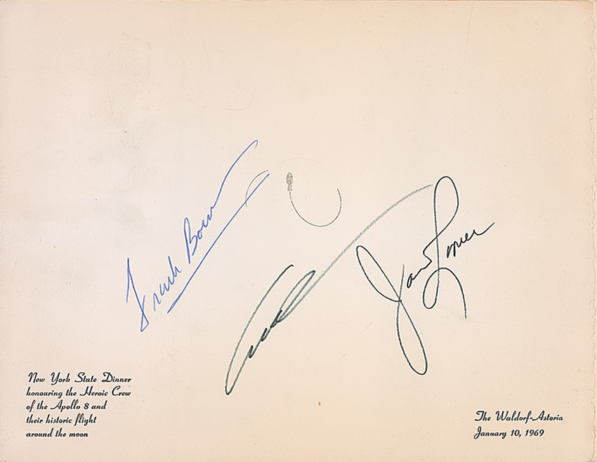 Presentation photo folder, 11 x 8.5, from the New York State Dinner honoring the Apollo 8 crew at the Waldorf-Astoria on January 10, 1969, with a color photo of the Earthrise taken from orbit inside, signed on the front cover in black felt tip by James Lovell and Bill Anders, and in blue ballpoint by Frank Borman. Accompanied by the menu/program from the event. In fine condition, with a bit of scattered light toning and a few bends. Pre-certified Steve Zarelli and RR Auction COA.