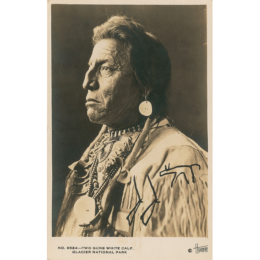 Blackfoot chief (1872–1934) best known for the durable though still-controversial claim that he served as one of models for sculptor James Earle Fraser in creating the composite Native American portrait on the ‘Buffalo’ nickel. Vintage 3.25 x 5.25 postcard photo, signed in black ink with his three-character pictogram of two rifles and a horned calf. Reverse bears a collector’s notation of provenance which states “I really saw this man to-night and asked him to write his name on this card. A good looking Indian in full dress. It is his picture on the U. S. nickel. July 24, 1929.” In fine condition, with mild silvering to darker areas of image and background. RRAuction COA.