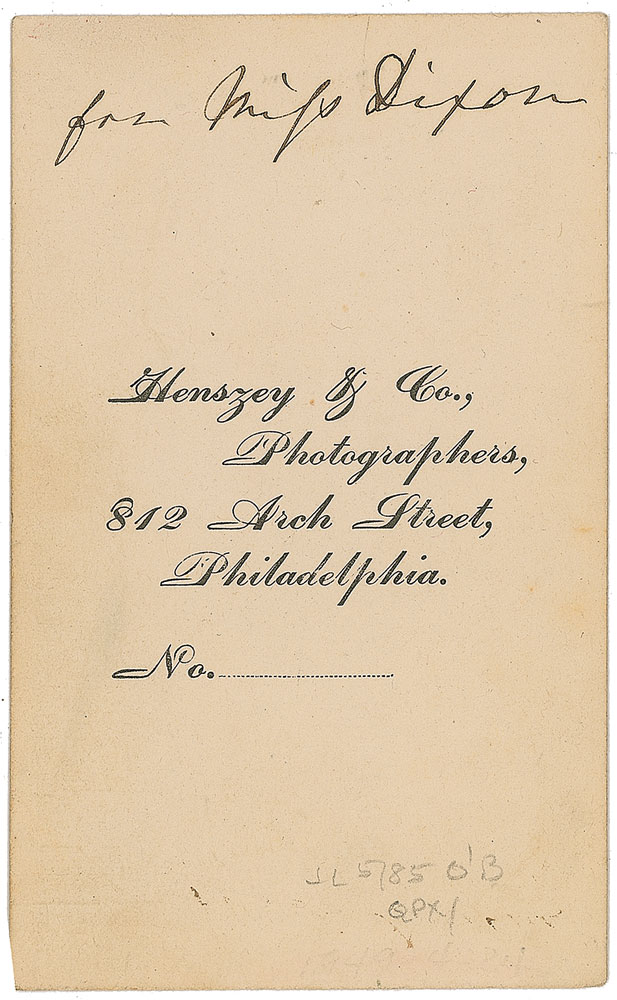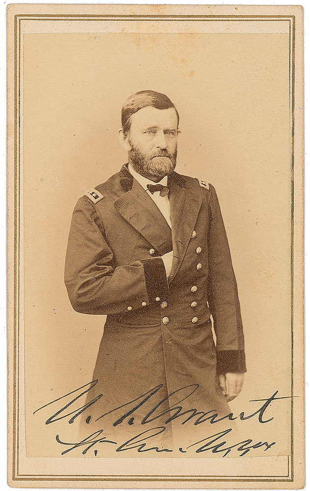 Desirable original 2.5 x 4 carte-de-visite three-quarter length portrait of Grant in military dress by Henszey & Co., signed at the bottom of the image in black ink, “U. S. Grant, Lt. Gen. U.S.A.,” and inscribed in an unknown hand on the reverse, “for Miss Dixon.” Printed text on the reverse reads: “Henszey & Co., Photographers, 812 Arch Street, Philadelphia.” Light soiling to the top, light silvering to dark areas of the image, and a trivial pencil notation to the reverse, otherwise fine condition. President Lincoln promoted Grant to the rank of lieutenant general on March 10, 1864, joining George Washington and Winfield Scott as the only officers to hold the rank up until that point. He held the position until 1869, when he took office as president. As such, Grant’s signature as lieutenant general dates this this carte-de-visite to the late 1860s. RR Auction COA.