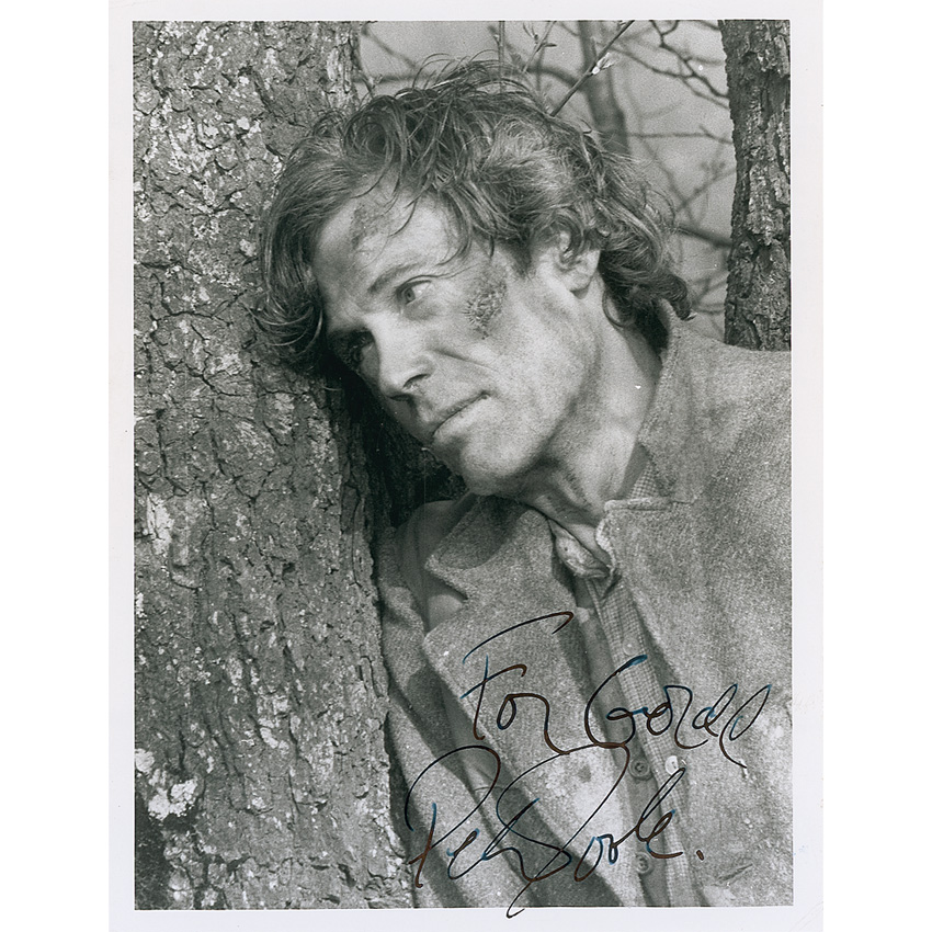 Glossy 6.5 x 8.5 photo of O’Toole in Rogue Male, signed and inscribed in fountain pen. In fine condition, with trivial corner tip creasing and scattered surface marks. Pre-certified PSA/DNA and RR Auction COA.