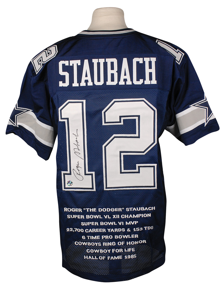 Official replica Dallas Cowboys football jersey, with sewn on letters and numbers and embroidered statistics, signed in black felt tip on the number on the back. In fine condition. Pre-certified Steve Grad/PSA/DNA and RR Auction COA.