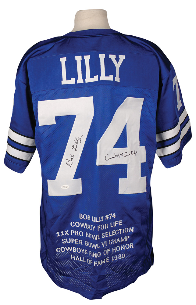 Replica Dallas Cowboys football jersey, with sewn on letters and numbers, as well as embroidered career highlights at the bottom of the back of the jersey, signed in black felt tip on the number on the back, “Bob Lilly, Cowboys for Life.” In fine condition, with a James Spence authentication label affixed to number. Accompanied by a certificate of authenticity from James Spence. Pre-certified Steve Grad/PSA/DNA and RR Auction COA.