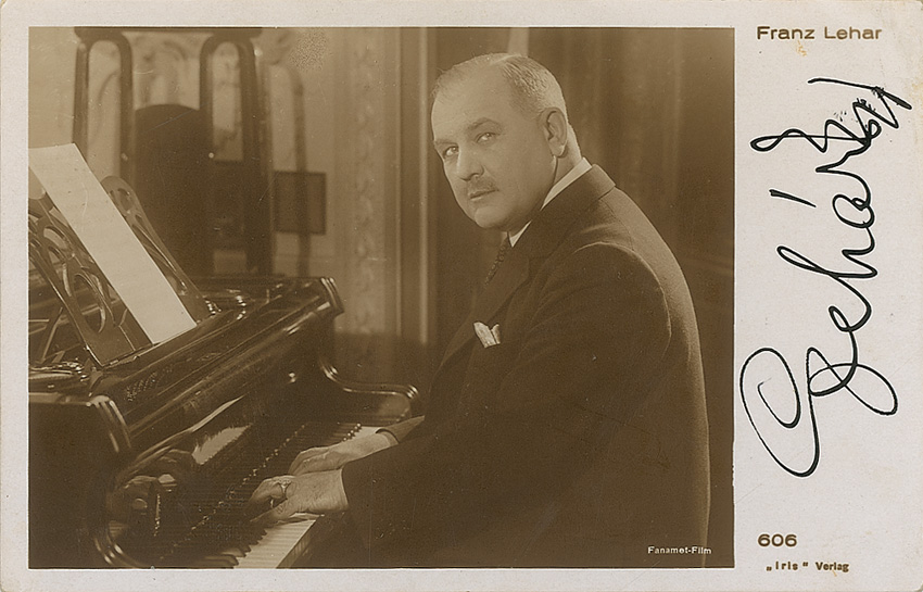 Vintage 5.5 x 3.5 postcard photo of Lehar at his piano, signed vertically in the right border in black ink. Light scattered soiling and surface impressions, and a trivial brush to the end of the signature, otherwise fine condition. RRAuction COA.