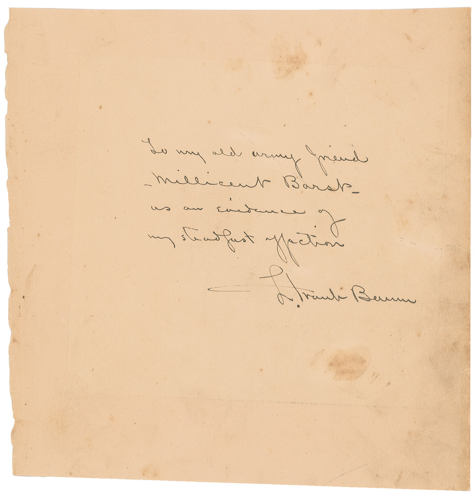 American author (1856–1919) best known for the children’s classic The Wonderful Wizard of Oz. Vintage ink signature and inscription, “To my old army friend—Millicent Barst—as an evidence of my steadfast affection, L. Frank Baum,” on an off-white 6.75 x 7 sheet. In very good condition, with scattered toning, soiling, and foxing, small chips and tears to left and right edges, and trimmed top and bottom edges. Without question one of the most sought-after literary autographs. Pre-certified John Reznikoff/PSA/DNA and RR Auction COA.