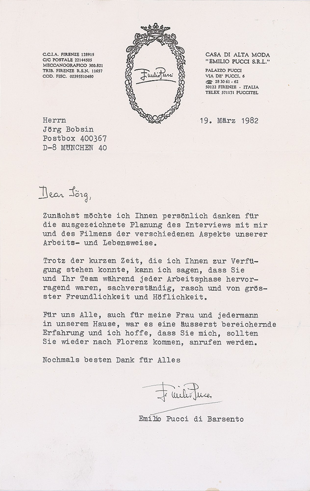 Italian fashion designer and politician (1914–1992). TLS in German, one page, 6.5 x 10.25, High Fashion House letterhead, March 19, 1982. Untranslated letter to a gentleman. In fine condition, with a couple light creases. RR Auction COA.