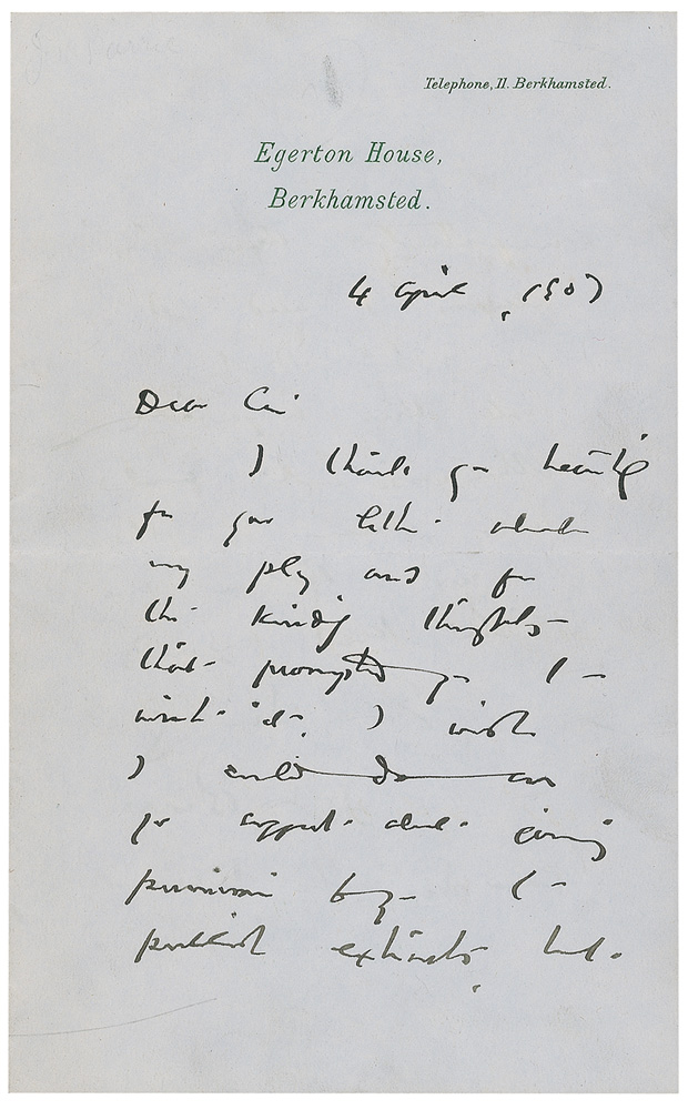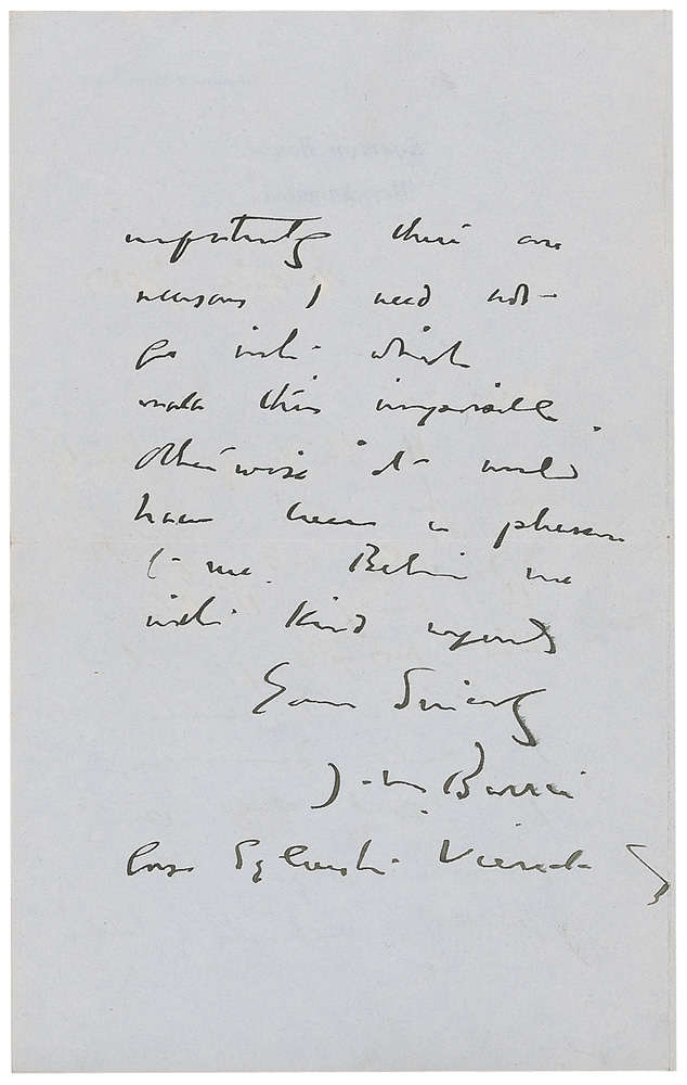 Scottish author and dramatist (1860–1937) best known for the classic children’s play Peter Pan. ALS signed “J. M. Barrie,” one page both sides, 5 x 8, Egerton House letterhead, April 4, 1907. Letter of thanks in Barrie’s difficult to decipher hand. In part: “I thank you heartily for your letter about my play and for the kind thoughts that prompted you to write it. I wish I could do as you suggest about giving permission…to publish exhibits.” Scattered creases, some light toning, and a light brush to signature, otherwise fine condition. Pre-certified PSA/DNA and RR Auction COA.