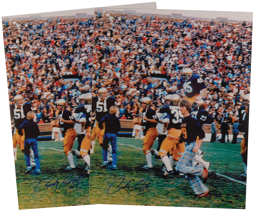 Two identical color satin-finish 16 x 20 photos of Ruettiger being carried off the Notre Dame field, each signed in blue felt tip, “Rudy Ruettiger 45.” In fine condition. RR Auction COA.