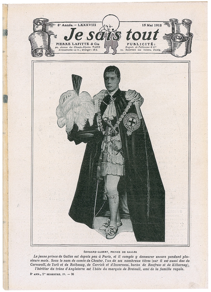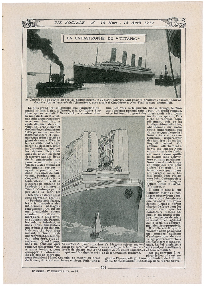 Je sais tout periodical published by Pierre Lafitte & Cie. of Paris, 6.25 x 9.25, 132 pages, May 15, 1912, featuring an article entitled “La catastrophe du ‘Titanic’” that includes 11 images related to the steamship, such as exterior and interior photos, portraits of Captain Smith, Jack Phillips, and famous victims, and illustrations of the liner. In very good condition, with covers absent and some slight separation to binding.